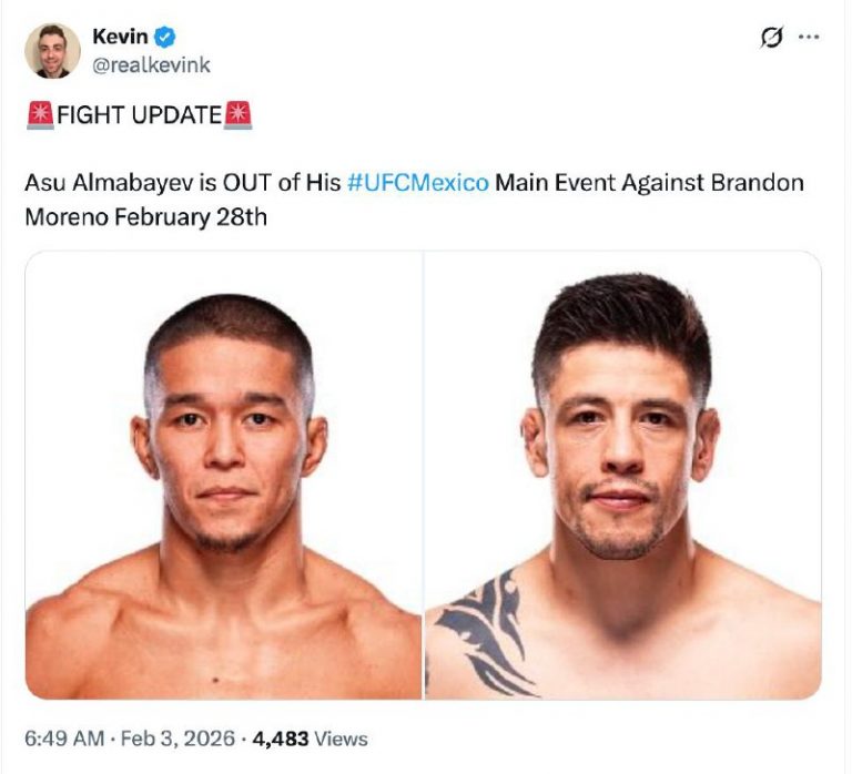 Казахстанский боец Асу Алмабаев не сможет провести главный бой вечера против Брэндона Морено на турнире UFC в Мексике. Причины пока неизвестны.