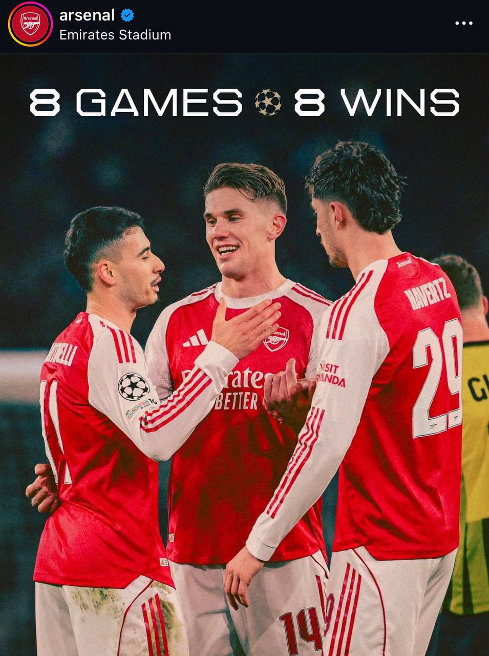Лондонцы стали первой командой в истории нового формата турнира, которая прошла групповой этап без потерь. «Канониры» одержали 8 побед в 8 матчах, набрав максимальные 24 очка. Для сравнения, прошлогодний победитель этапа «Ливерпуль» финишировал с 21 баллом.
